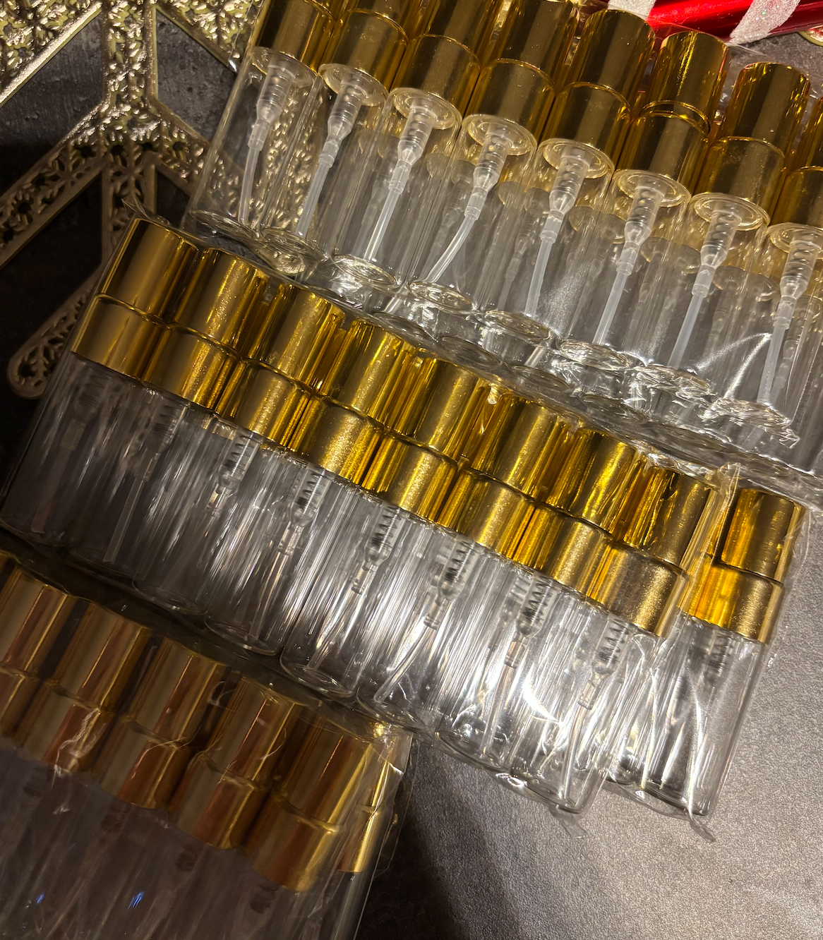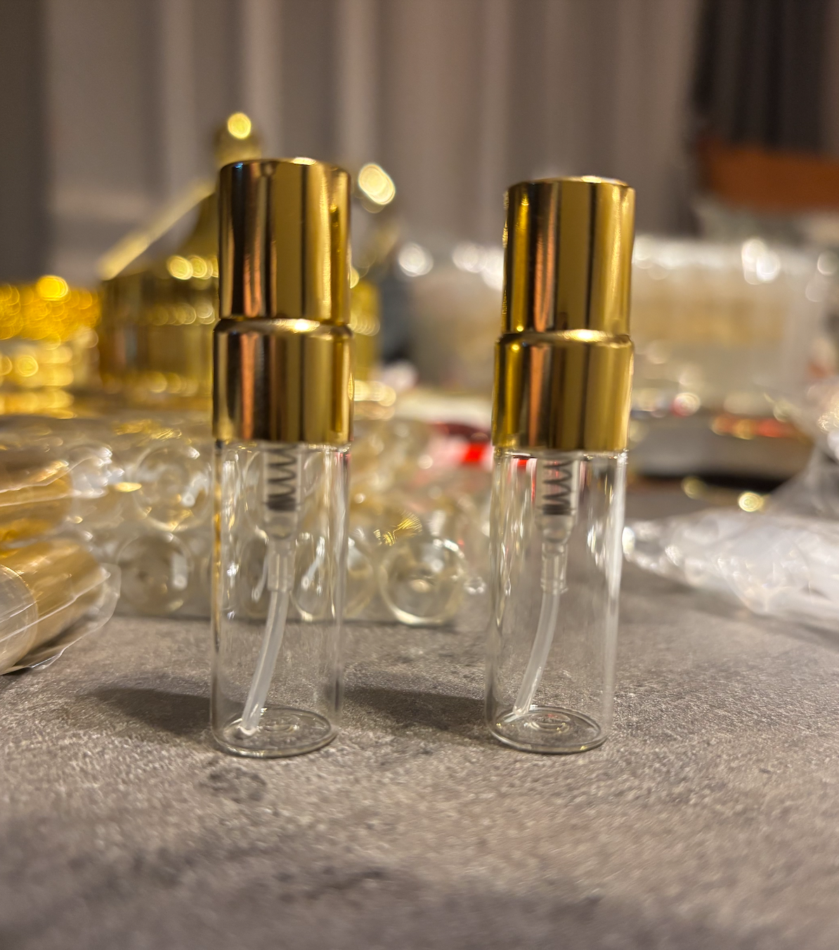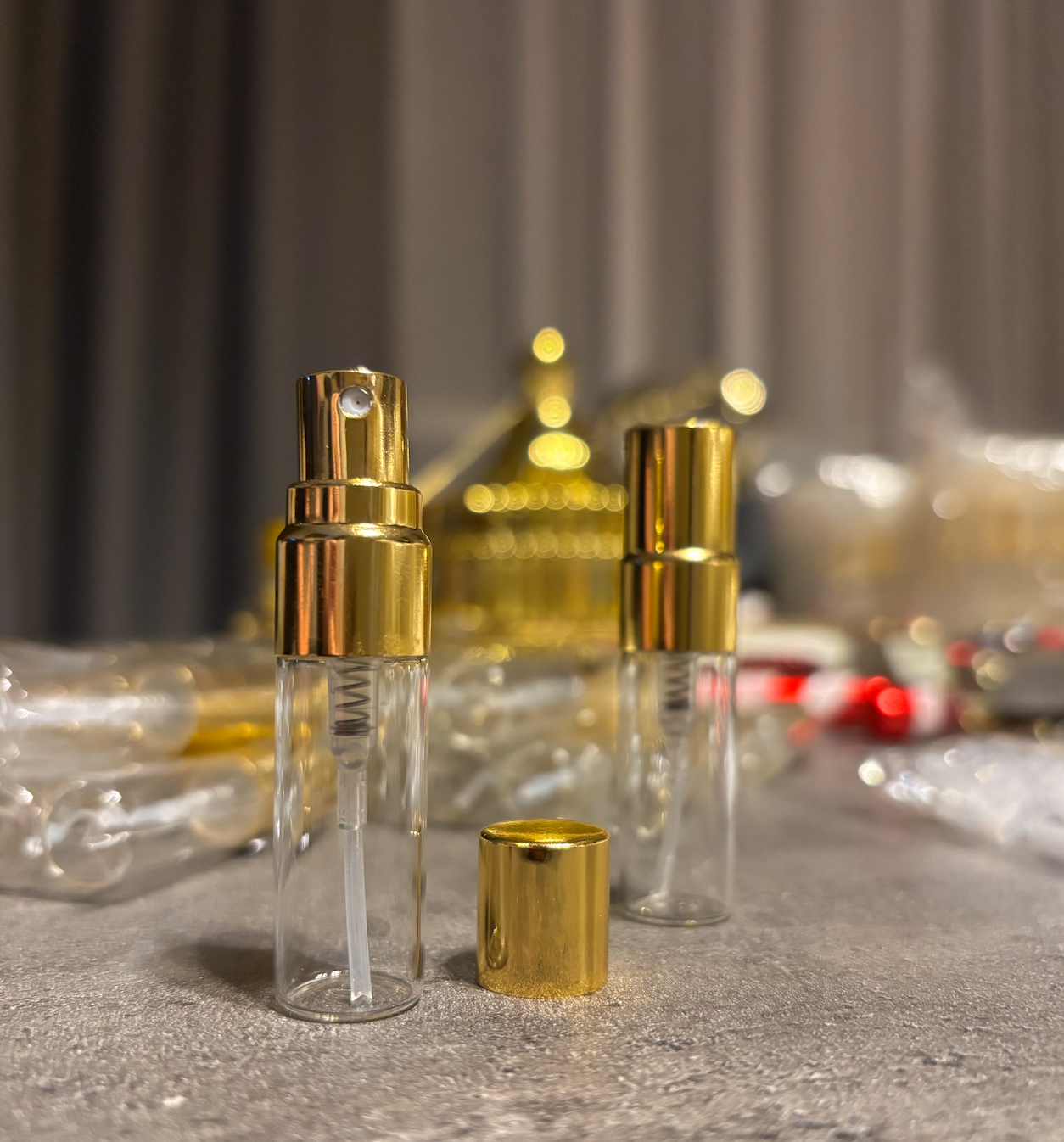 Empty refillable glass perfume tester bottle 3ml with sprayer in gold color.