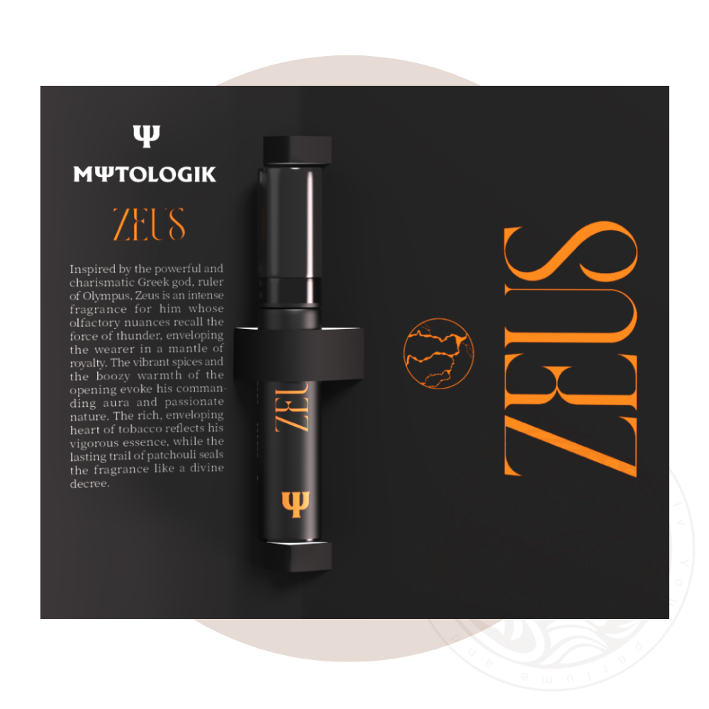 Voimakkaan ja karismaattisen kreikkalaisen jumalan, Olymposin hallitsijan, inspiroima MΨTΟLOGIK Zeus on hänelle suunnattu intensiivinen tuoksu, jonka tuoksun vivahteet tuovat mieleen ukkosen voiman, joka kietoo kantajansa kuninkaalliseen viittaan. Avautuoksujen kirkkaat mausteet ja lämpö tuovat mieleen hänen hallitsevan auransa ja intohimoisen luonteensa. Rikas, ympäröivä tupakan sydäntuoksu heijastaa hänen energistä olemustaan, kun taas viipyilevä patsulin tuoksu päättää tuoksun jumalallisena tuomiona.