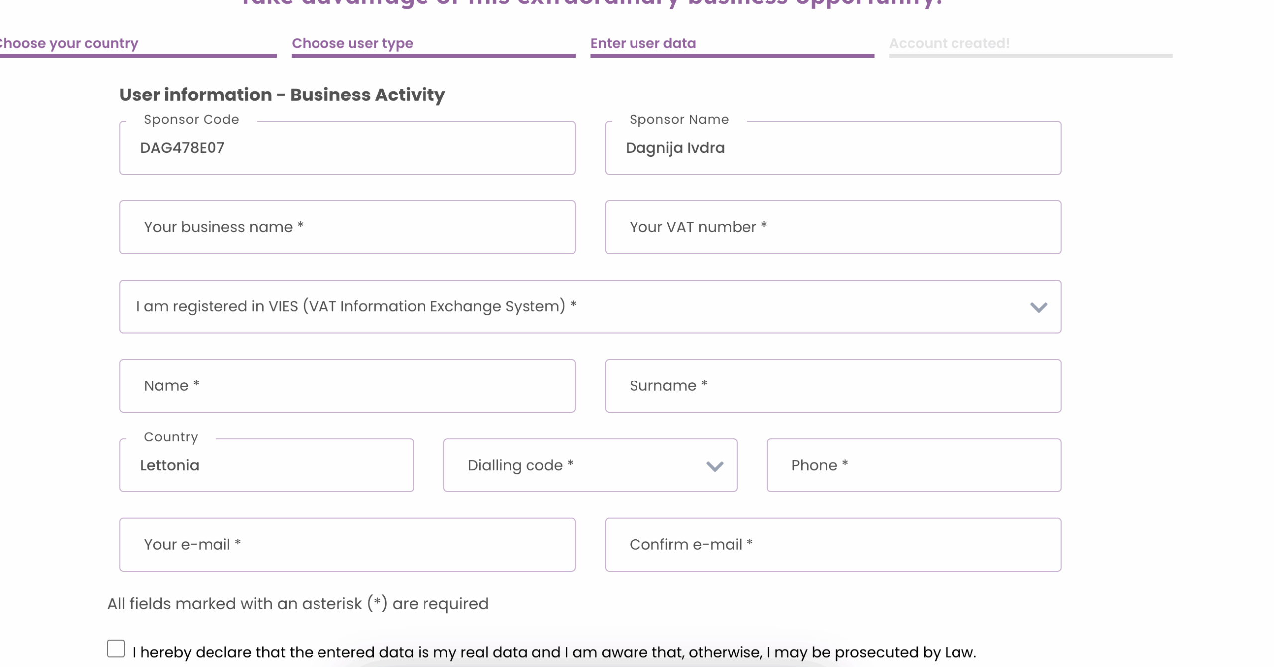 2.5. Ievadi manu sponsora kodu – DAG478E07 un aizpildi visus nepieciešamos datus. Bez sponsora koda nebūs iespējams reģistrēties.